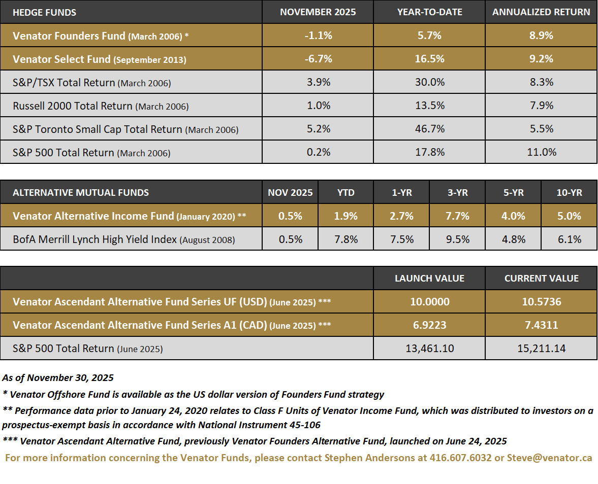 Commissions, trailing commissions, management fees and other expenses all may be associated with investing in any of the Venator Alternative Mutual Funds. Please read the prospectus and Fund Facts relating to each Alternative Mutual Fund before investing. The indicated rates of return of the Venator Alternative Mutual Funds are the historical annual compounded total returns, including changes in share or unit value and the reinvestment of all dividends or distributions, and do not take into account sales, redemption, distribution or optional charges or income taxes payable by any securityholder that would have reduced returns. Mutual funds are not guaranteed, their values change frequently, and past performance may not be repeated.