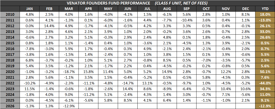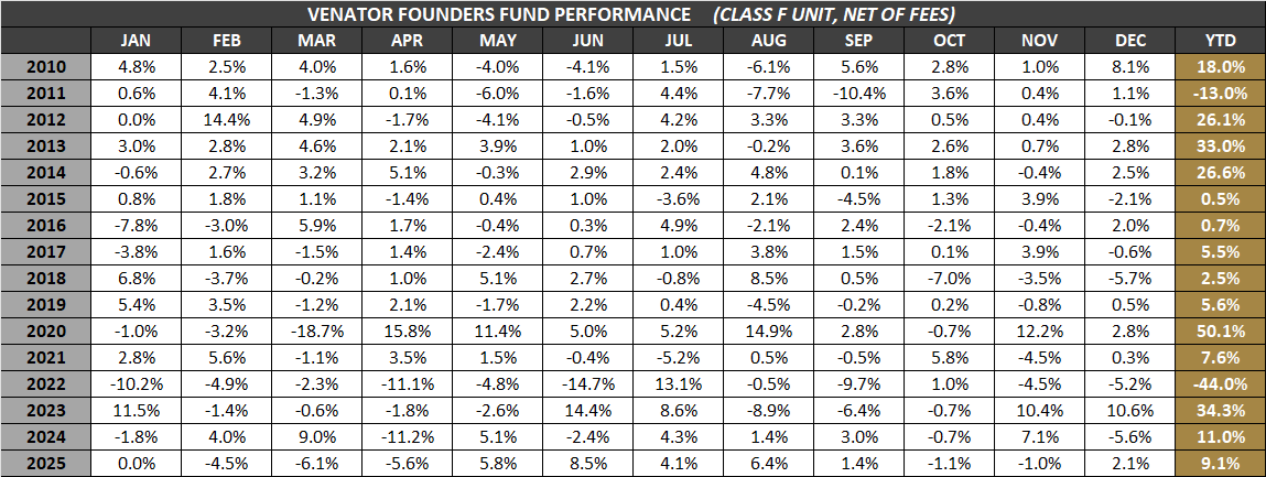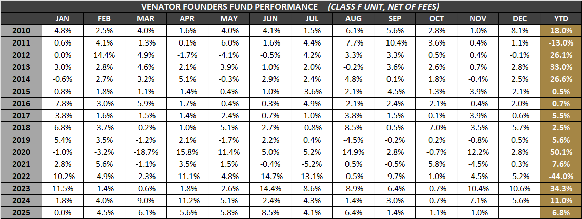 VENATOR FOUNDERS FUND is a North American long/short equity strategy which strives to capitalize on exceptional investment opportunities. The Fund focuses on business fundamentals with a bottom-up investment approach in order to identify high growth companies that are undiscovered (or unappreciated) by the market; as well as out of favour companies trading at low valuations that do not reflect ‘hidden assets’, intermediate business prospects, reversing business trends, or changing managerial philosophies.