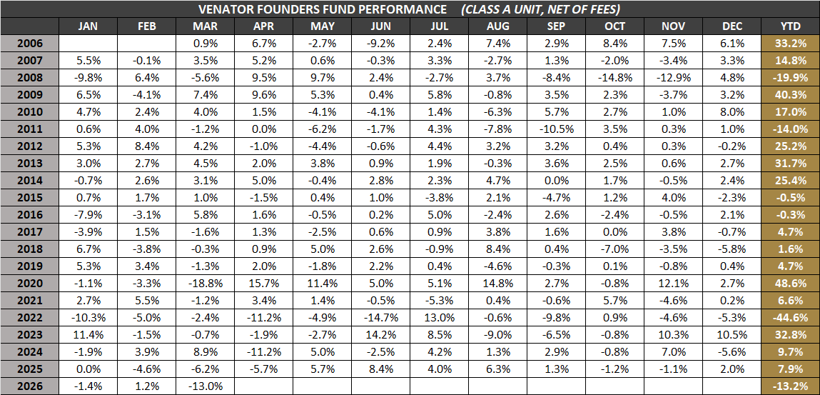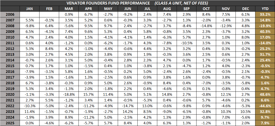 The Venator Hedge Funds may only be purchased by accredited investors with a medium-to-high risk tolerance seeking long-term capital gains. Please read the Offering Memorandum for each Hedge Fund in full before making any investment decisions. Prospective investors should inform themselves as to the legal requirements for the purchase of securities. All stated Venator Hedge Fund returns are net of fees. It is important to note that past performance should not be taken as an indicator of future performance.