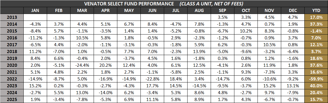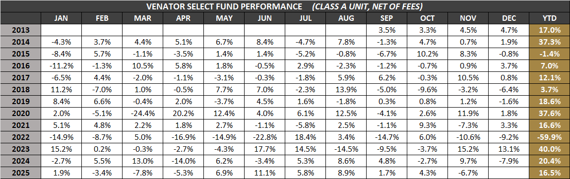 The Venator Hedge Funds may only be purchased by accredited investors with a medium-to-high risk tolerance seeking long-term capital gains. Please read the Offering Memorandum for each Hedge Fund in full before making any investment decisions. Prospective investors should inform themselves as to the legal requirements for the purchase of securities. All stated Venator Hedge Fund returns are net of fees. It is important to note that past performance should not be taken as an indicator of future performance.