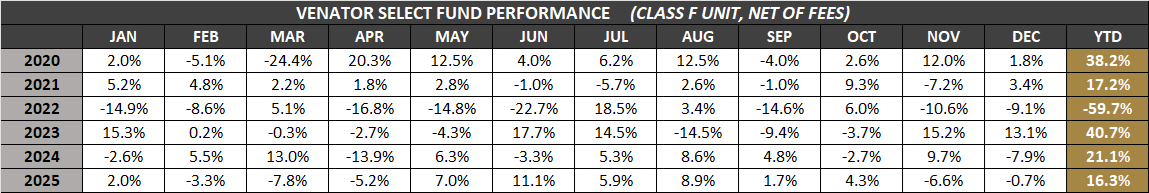 VENATOR SELECT FUND is a ‘best ideas’ strategy that strives to generate superior returns by concentrating investments in a small number of opportunities. The Fund can take both long & short investment positions in equity, debt, and derivative securities; as well as strategic trading in special situations. The allocation of long & short positions will vary depending on the opportunities that the Manager believes offer the best reward per unit of risk.